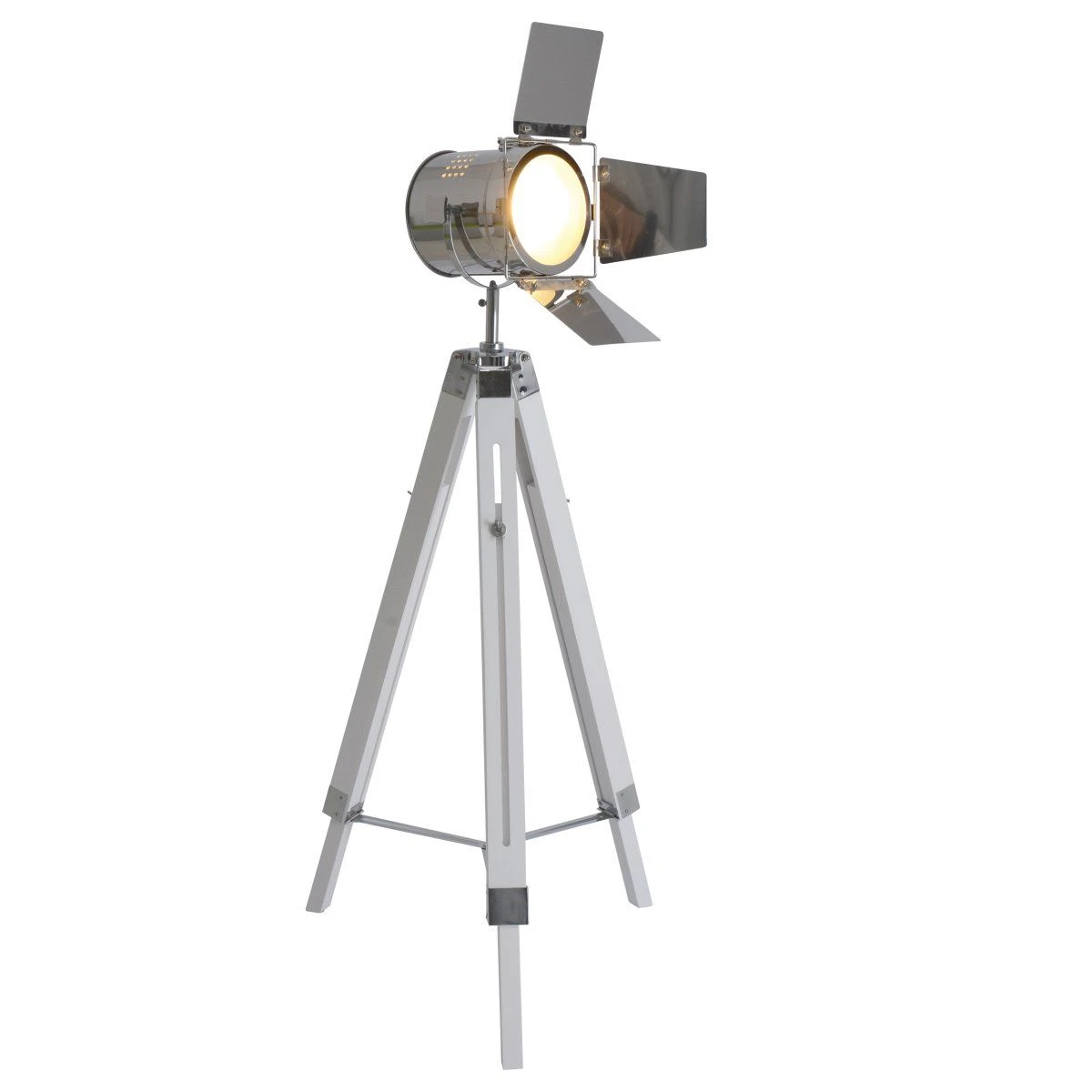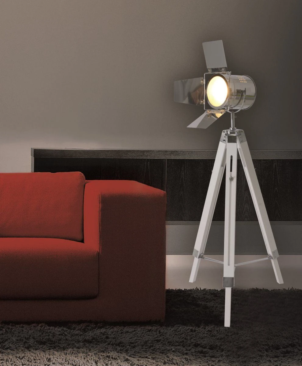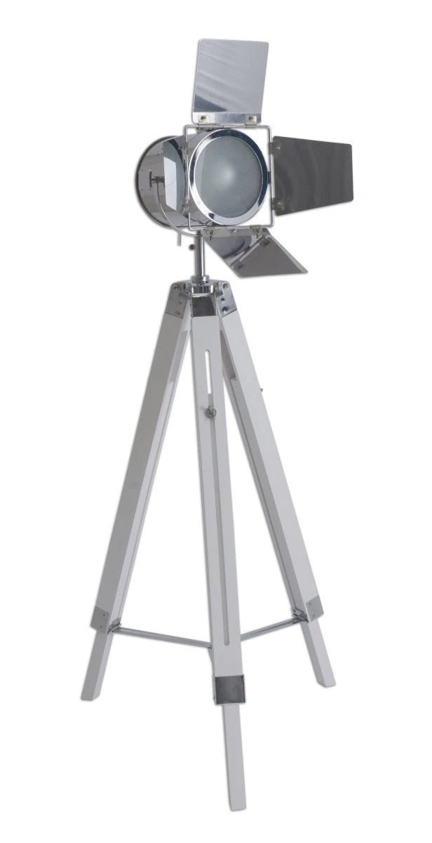 Gefertigt aus Holz und Metall, wurde die Lampe in Weiß und Chrom lackiert. Da sich Weiß perfekt mit anderen Farbtönen kombinieren lässt, liegen Sie mit dieser Farbgebung genau richtig. Mit Standfüßen in Stativform ausgestattet, ist die Retroleuchte ein absoluter Blickfang für Ihre Wohnräume. In Kontrast zur weißen Farbgebung runden die chromfarbenen Details im Lampenschirm und am Ständer das Gesamtbild der Leuchte ab.