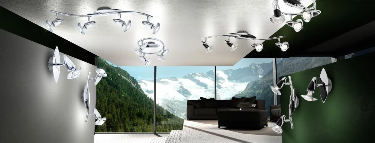 Dieser vierflammige Strahler aus Chrom passt in viele Wohnumgebungen. Natürlich kann dieses Modell auch mit energiesparenden LED-Leuchtmittel betrieben werden.