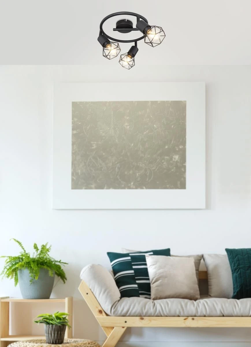 Dieser 180x230mm große spiralförmig gebogene Deckenstrahler Xara I von Globo wurde aus robustem Metall entworfen. Seine Aufmachung mit drei schwarzen diamantförmigen Metallkäfigen an einem „e“ aus schwarzem Metall zieht alle Blicke auf sich.