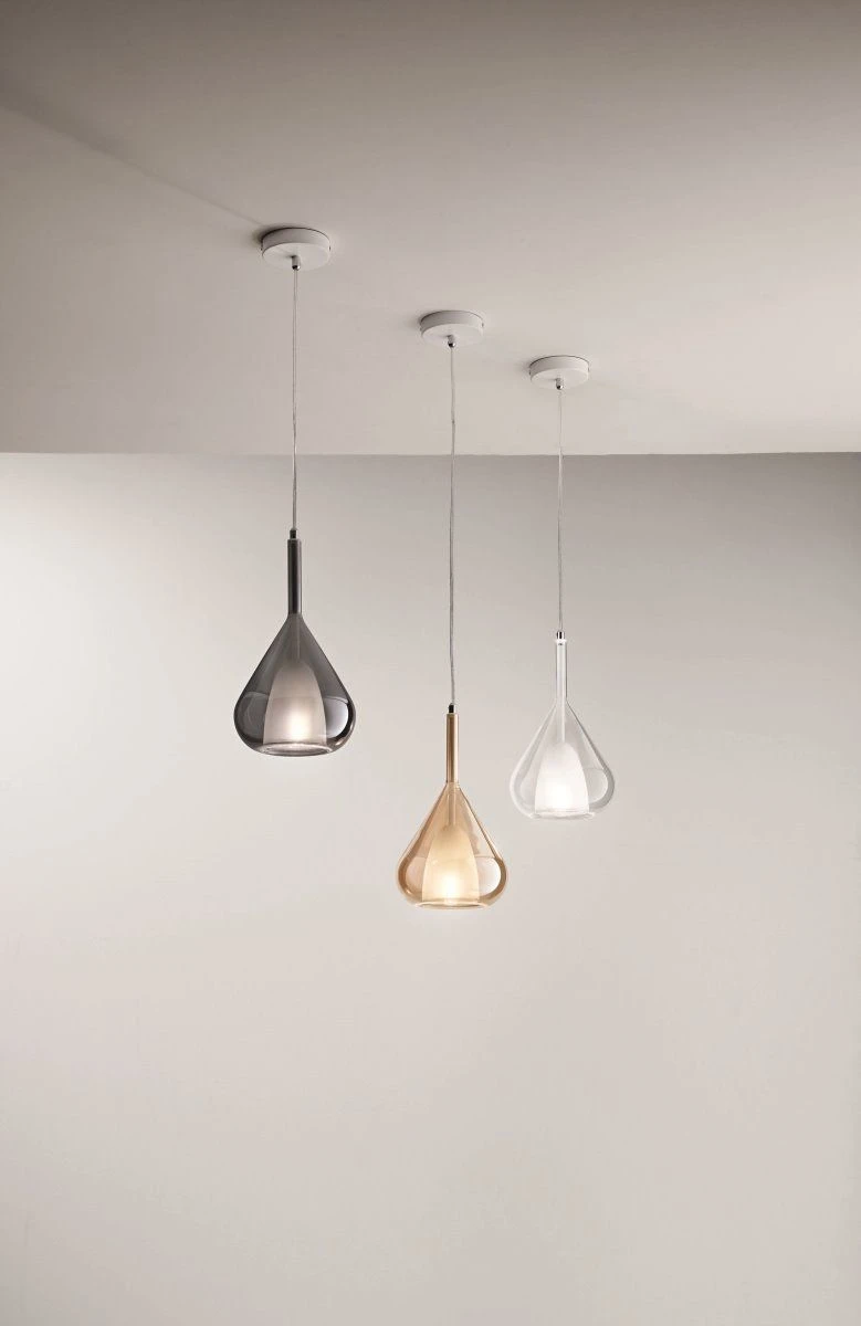 markante Glas-Pendelleuchte in verspielter Tropfenform und eingearbeitetem weißem Innenglas