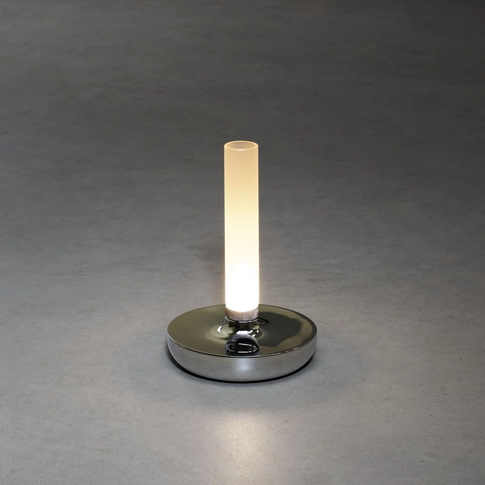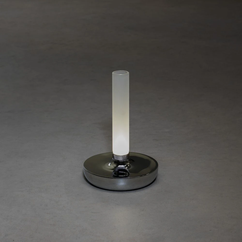 Die Leuchtenfamilie Biarritz von Konstsmide, mit einem erstklasssigen Design, gehört zu den akkubetriebenen Outdoor-Leuchten. Auf der Unterseite des Fußes kann eine USB-Ladestation angebracht werden, welche dem Lieferumfang angehört. Der Akku versorgt die inkludierte LED der Tischlampe nach voller Aufladung bis zu 9h mit Energie. Die modern gehaltene Tischleuchte Biarritz, welche auch als Vase verwendet werden kann, vereint satiniertes zylindrisches Glas mit einem runden Fuß aus silberfarbenem rostfreien Stahl. Dank satiniertem Schirm erhalten Sie hier ein dekoratives Leuchtobjekt für Ihren Tisch, welches ein angenehm diffuses Licht spendet.