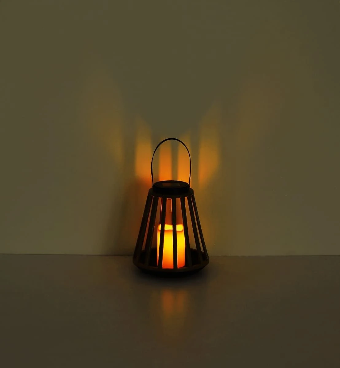 Ab Schwinden des Tageslichtes beginnt die Solarlaterne flackernd zu leuchten und ahmt damit eine Kerze nach. Diese befindet sich im Inneren der Laterne und ist ebenfalls aus Kunststoff.