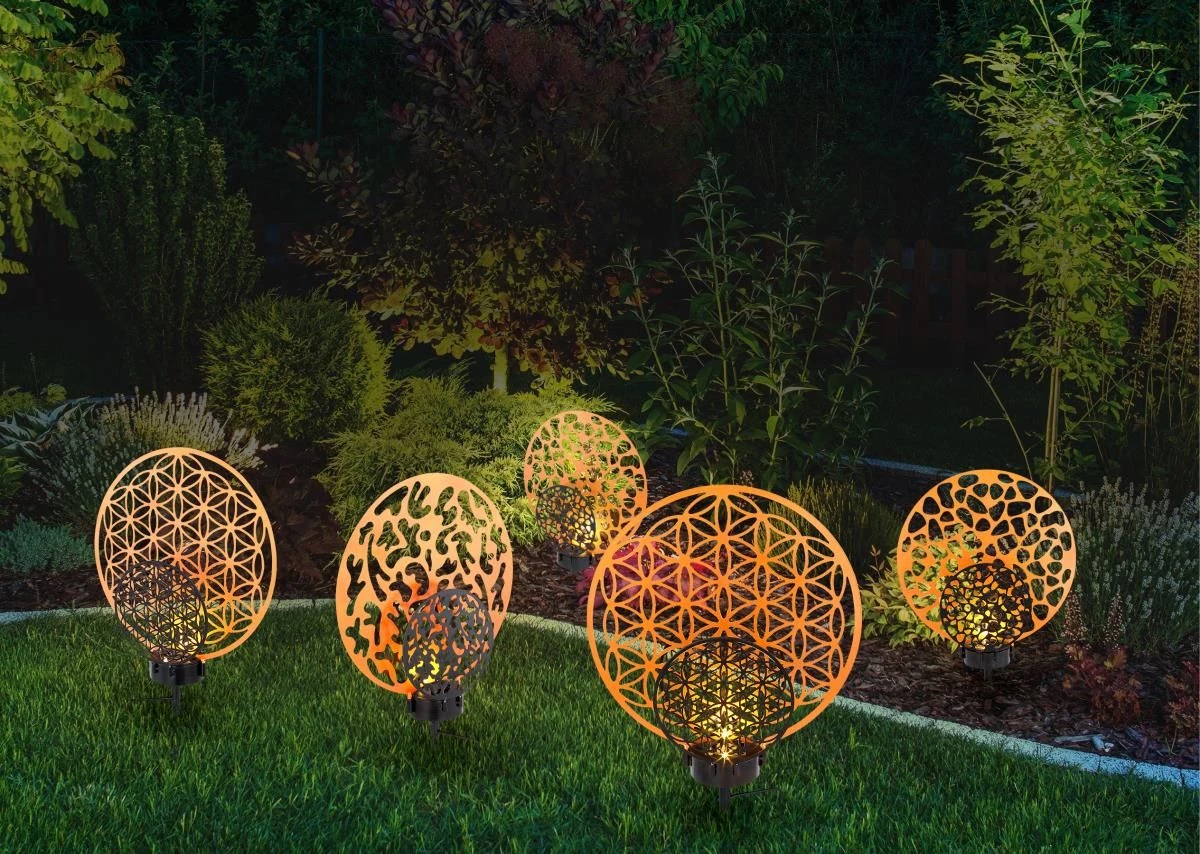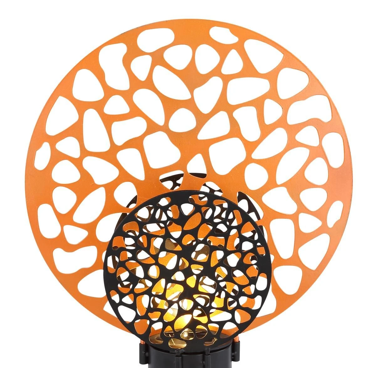 Vervollkommnen Sie Ihren Garten mit Licht und dieser tollen schwarz goldfarbenen LED Solarleuchte 3 runde Scheiben mit Dekorstanzungen, welche bereits am Tage aufgrund des faszinierenden Musters im Mittelpunkt steht.