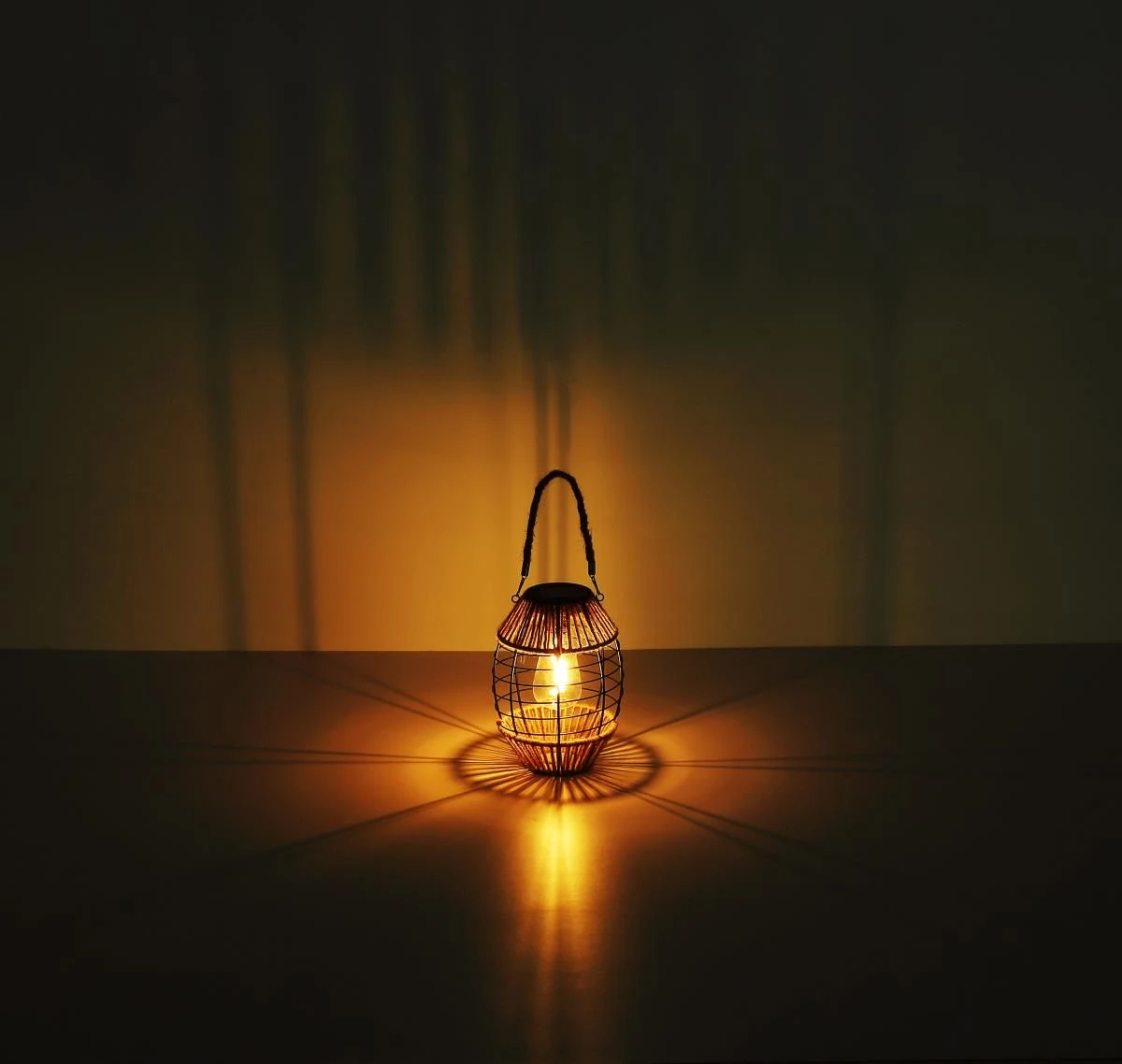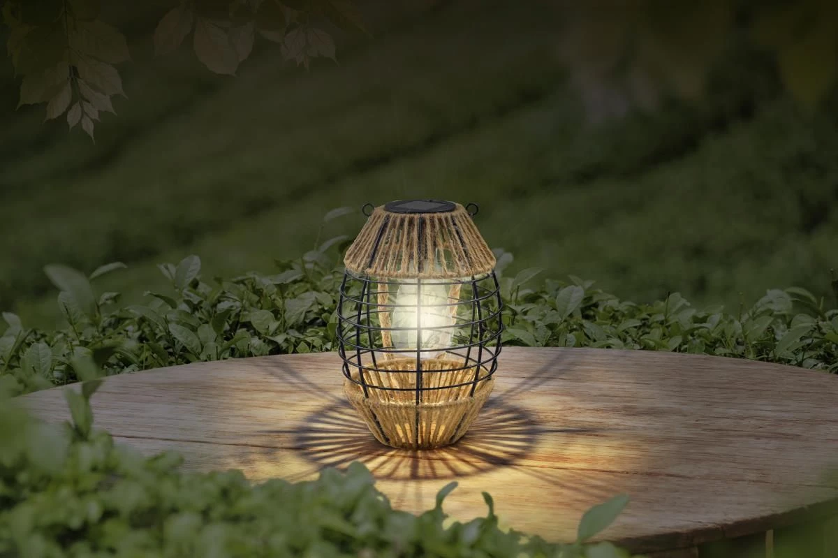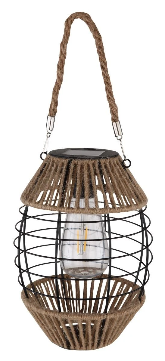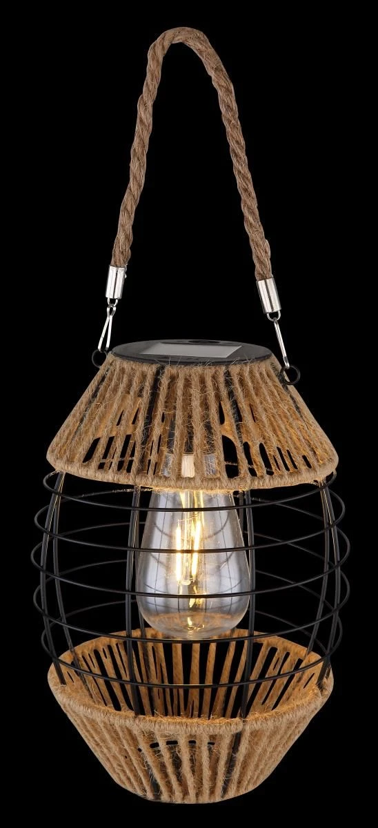 Sobald die Dämmerung eintritt und der Akku geladen ist beginnt die eiförmige Solarleuchte von Innen heraus durch das matt schwarze Metallgitter zu leuchten. Teilweise ist dieses Gitter mit naturfarbenem Hanf umwickelt. Auch verfügt diese Solar Laterne über einen Henkel aus Hanfseil und Edelstahl sowie einem Kunststoff LED Filament Leuchtmittel, welches für eine angenehme Lichtverteilung sorgt.