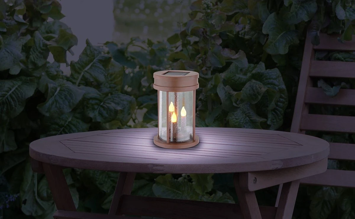 Von Weitem wirkt die Solarlaterne in Ihrer Farbwahl und in Kombination mit den Kerzen wie eine verwitterte altertümliche Leuchte. Die Luftblasen unterstreichen diesen Touch und wirken wie kleine Tautropfen oder Wasserperlen. Hinzu kommen die flackernden LEDs der 3 Kerzen, welche bei geladenem Akku und ab einsetzender Dämmerung zu leuchten beginnen.
