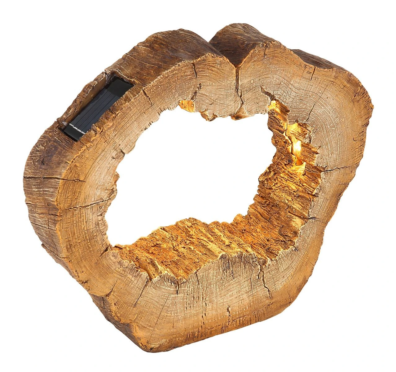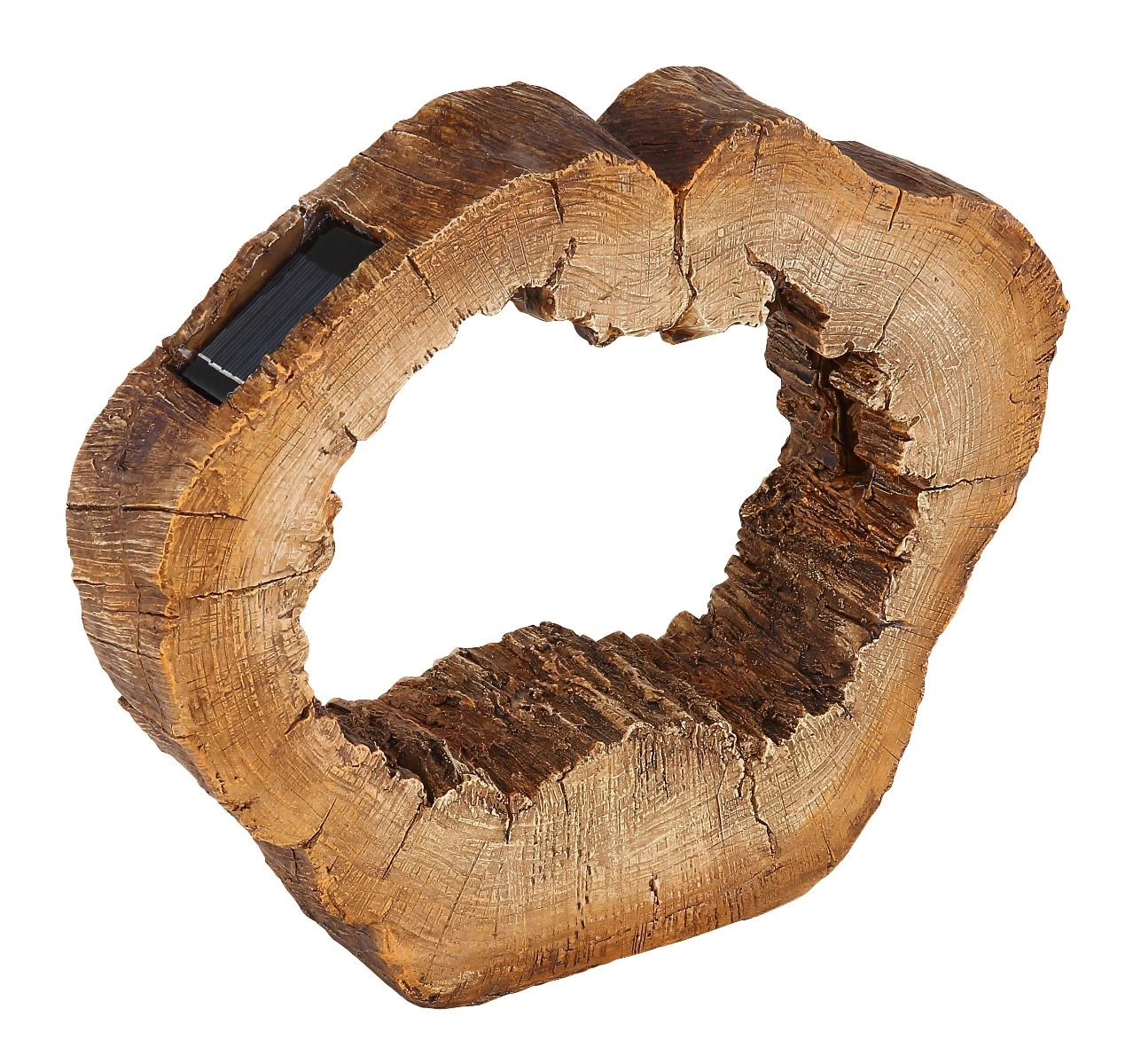 Diese Solarleuchte Baumstamm in Scheibenform mit einem Loch in der Mitte ist aus Kunststoff mit naturnaher Färbung. Die Ausführung in Kunststoff hat den Vorteil, dass die Holzoptik ihre Form behält und eine Rissbildung, wie bei natürlichem Holz möglich, entfällt.