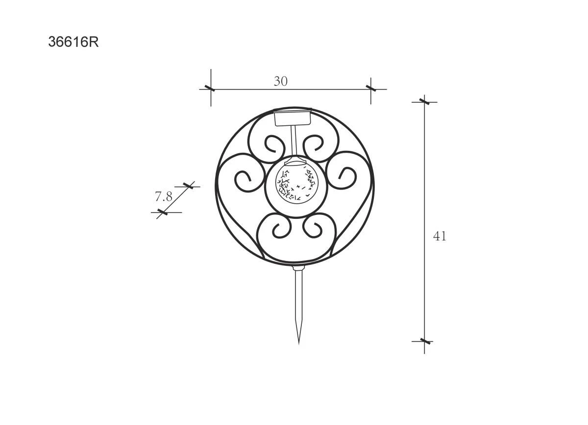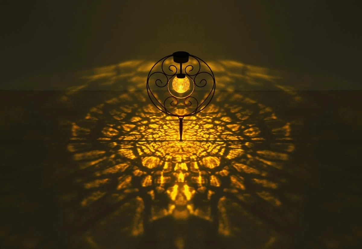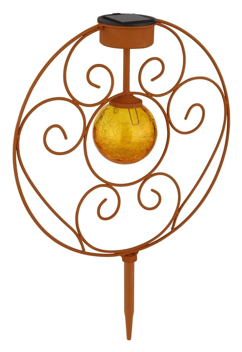 Das angenehm warmweiß leuchtende LED-Leuchtmittel inmitten einer amberfarbenen Glaskugel in Crackle-Optik scheint von der Mitte der rostfarbenen Solarleuchte auf das elegante 300mm im Durchmesser betragene Muster. Ab einsetzender Dämmerung eröffnet sich Ihnen somit ein beeindruckender Schattenwurf.