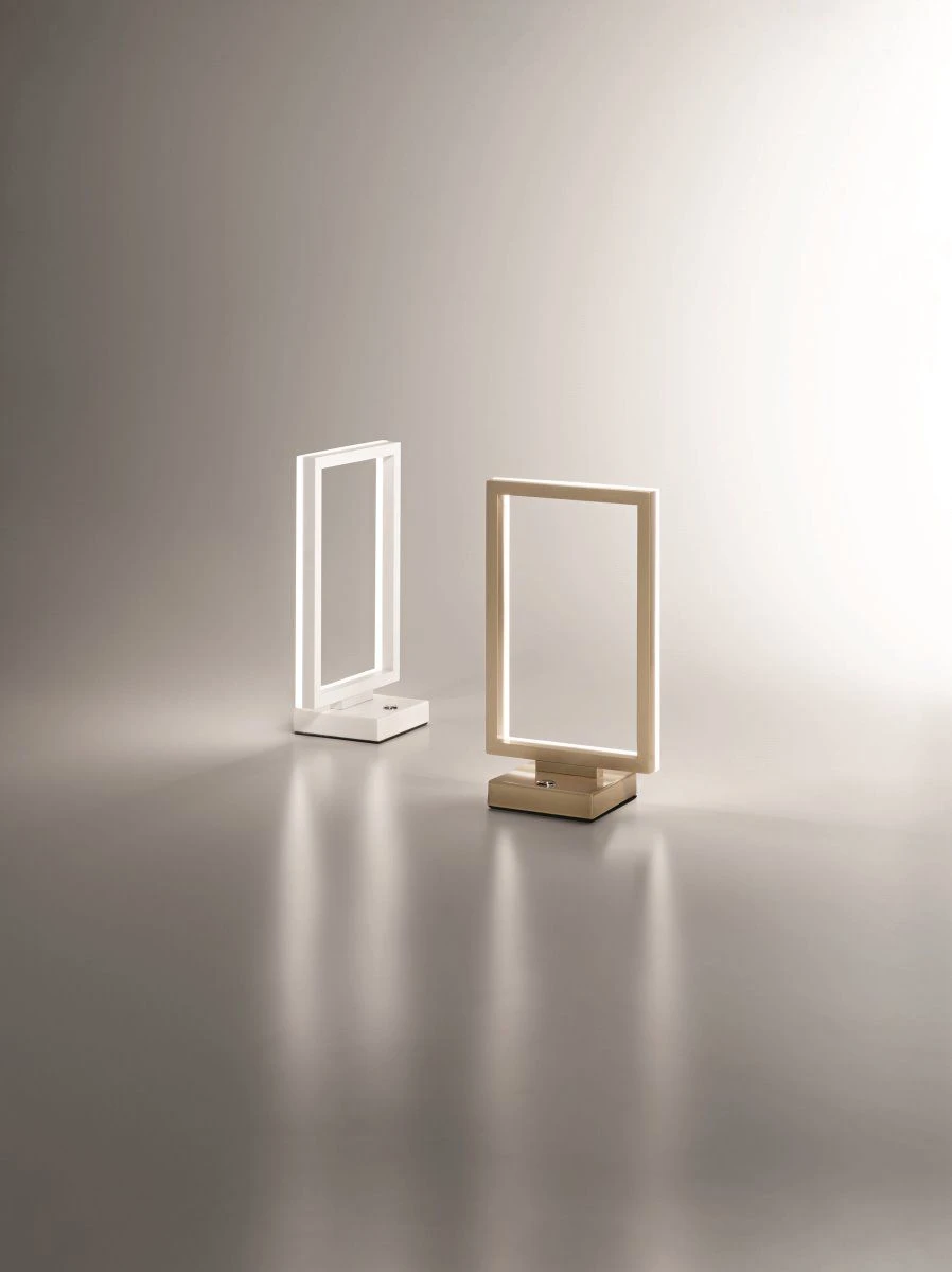 Diese 30 cm hohe filigrane Tischleuchte in weiß besteht aus einem Methacrylatabgedeckten Rahmen mit verbauten LED,s als Lichtquelle, der auf dem 110 mm großen Lampenfuß befestigt ist und ein angenehmes warmes Licht ab gibt. Die Bedienung erfolgt über den Tastdimmer. Ob als Nachtischlampe oder nur als Blickfang im Wohnzimmer oder Flur, eine tolle neue moderne Form von Leuchten.