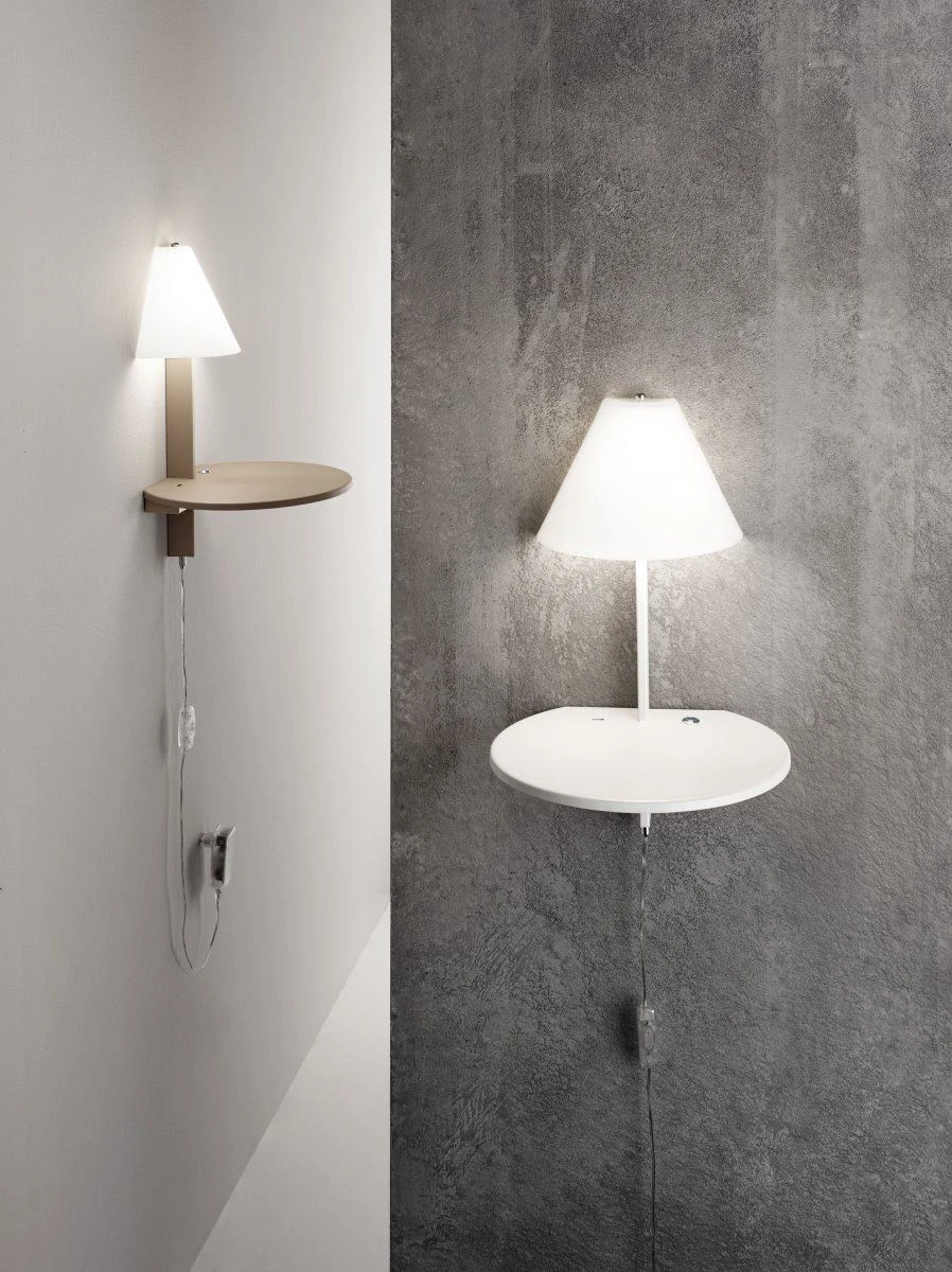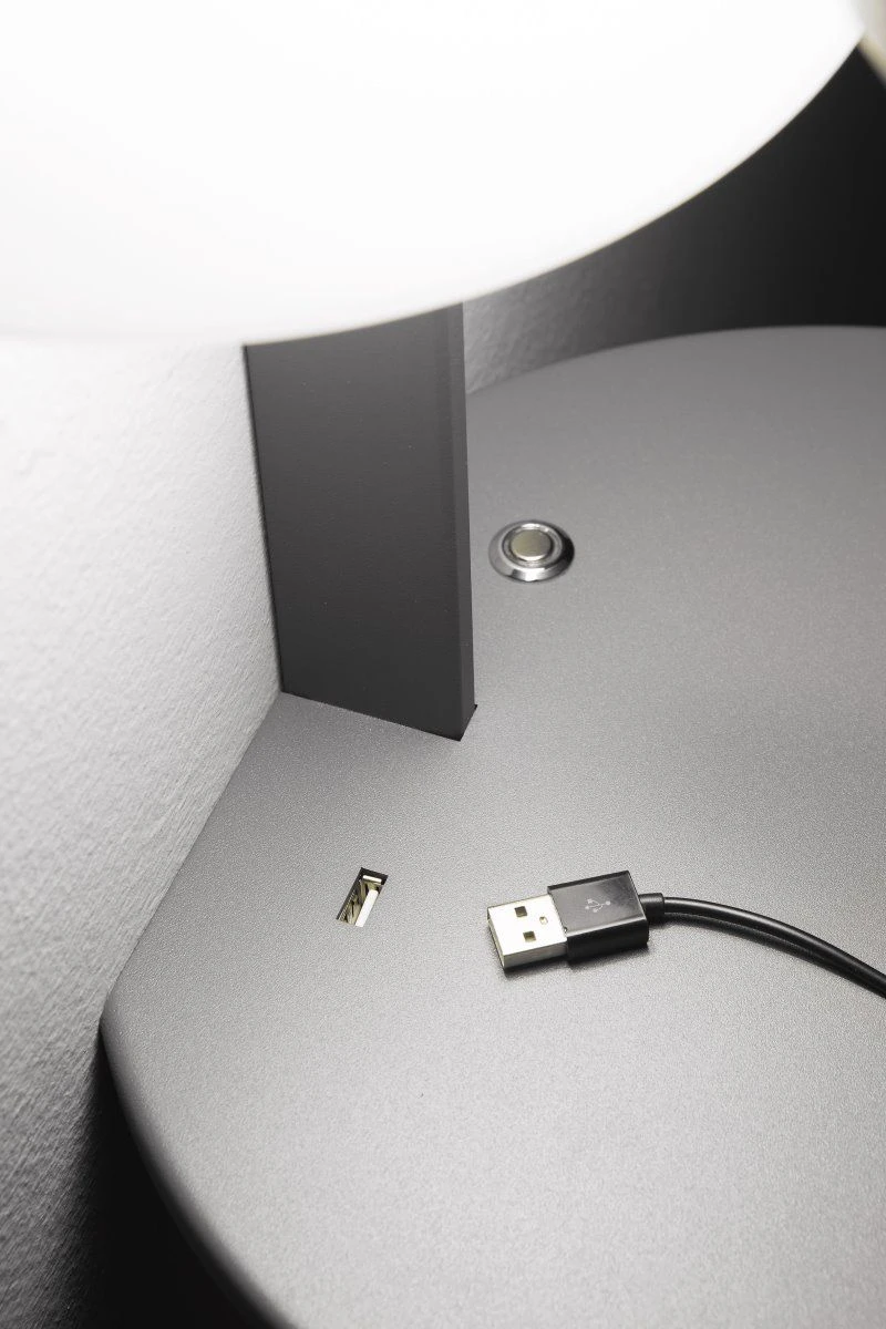 Multifunktionale Tischleuchte in Kombination mit angesetzter Tischablage , integriertem Tastdimmer und USB-Port