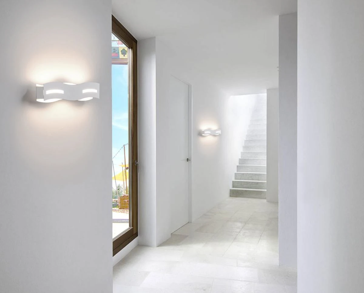 Die wellenförmige Wandleuchte „Wave“ der Marke ECO-Light, kommt in einem sehr stilvollen, modernen Design. Das Leuchtmittel scheint durch 2 Aussparungen an der Vorderseite der Lampe, sowie aus den gewellten Seiten heraus. Die nickel-matt-farbene Leuchte strahlt warmweißes Licht bei einer Leistung von 12 Watt mit 800 Lumen und ist individuell dimmbar.