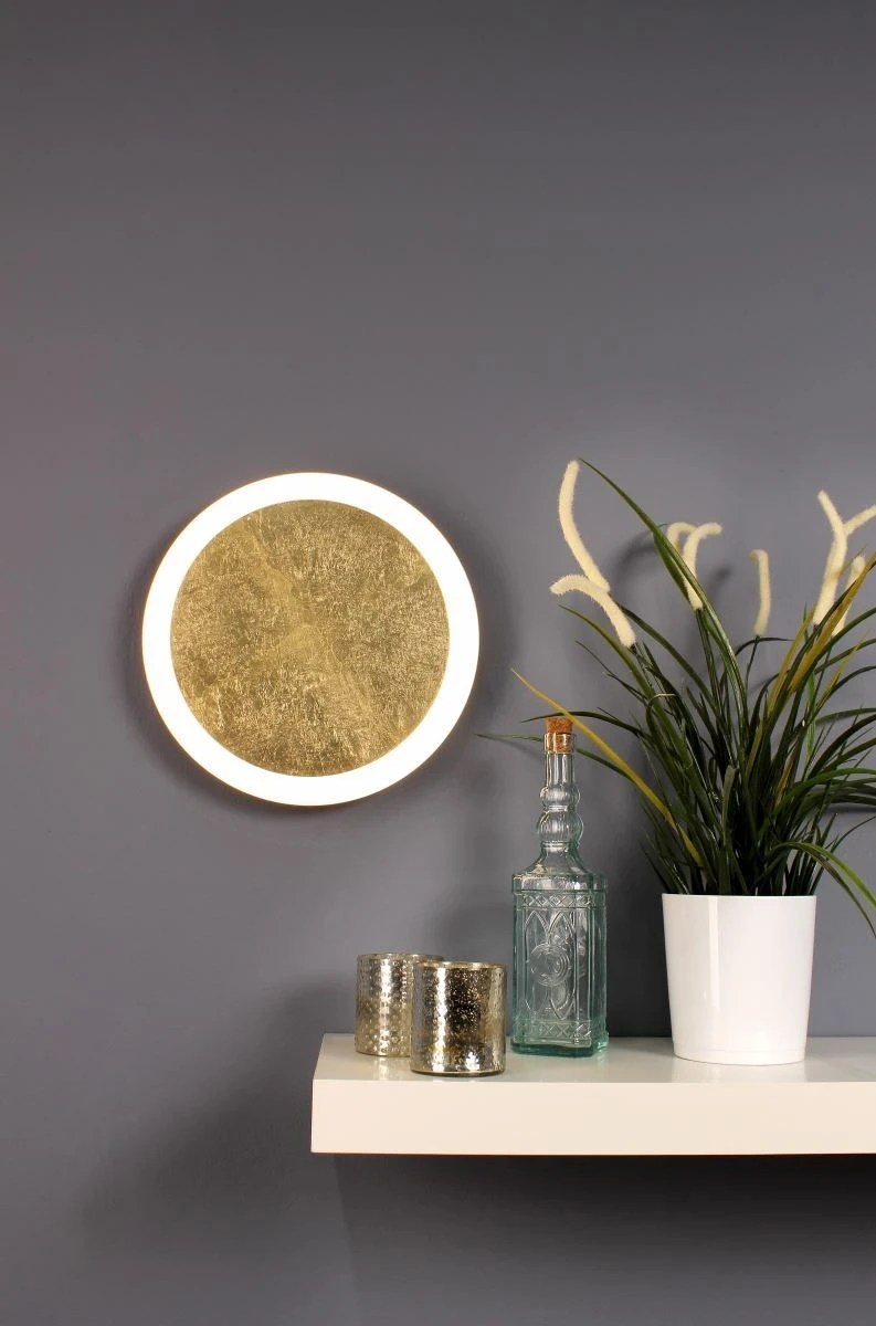 „Window“ ist ein Luce Design der Firma Eco-Light. Die runde Wandleuchte ist verziehrt durch eine goldene Innenfläche und der äußere Rand fungiert dabei wie ein leuchtender Rahmen. Das Licht ist dimmbar und kann somit nach Belieben angepasst werden. Ihr schlichter schwarzer Rand trägt das Leuchtmittel in sich, welches bei einer Leistung von 18 Watt mit 1200 Lumen leuchtet.