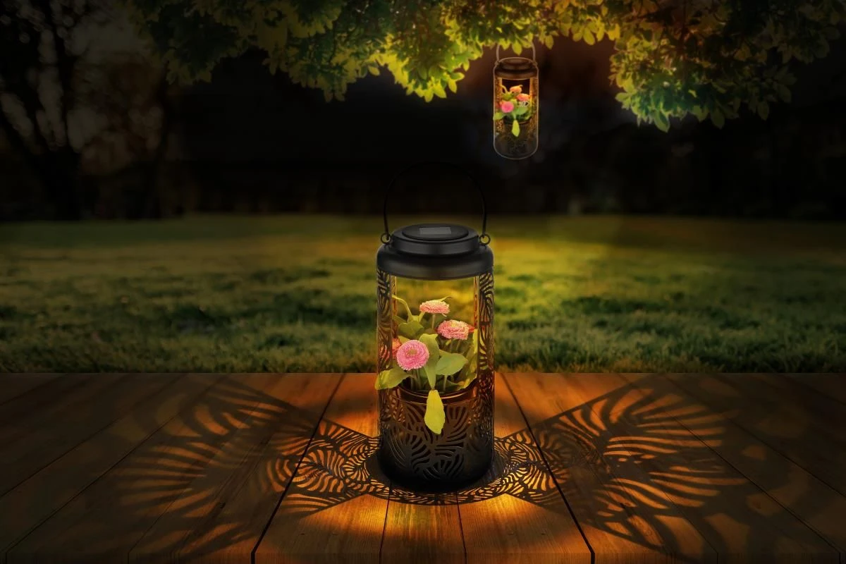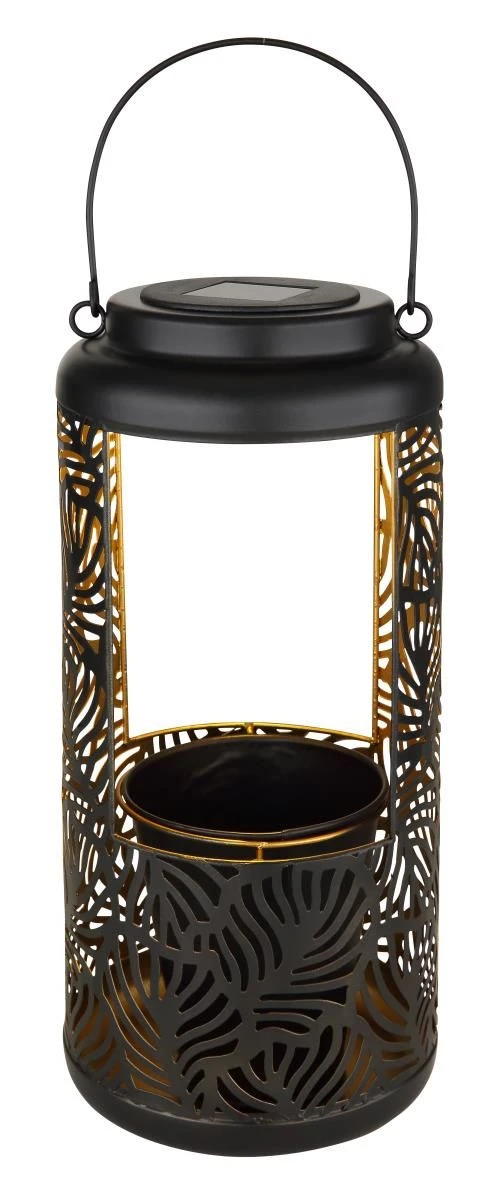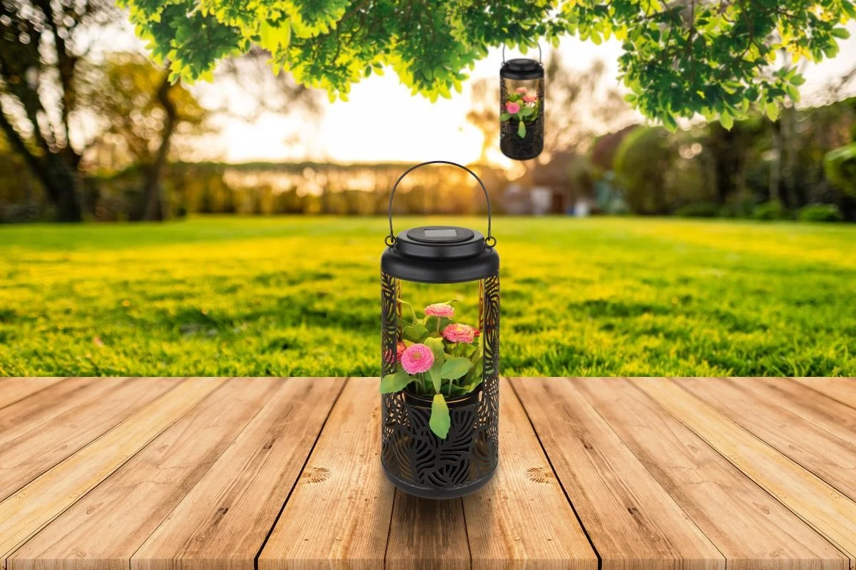 Entdecken Sie diese angesagte portable 15x41cm große LED Solar Laterne mit Dekorstanzungen und Platz für einen Pflanztopf!