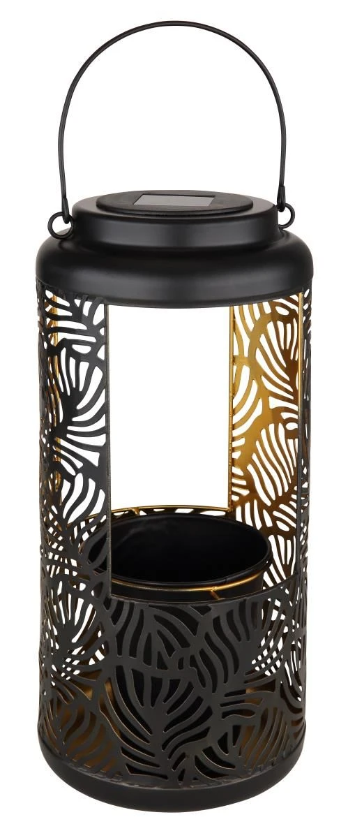 Die schicke Metalllaterne in schwarz-matt ist mit einem pflanzenförmigen Muster (Blätter) versehen und an 2 Seiten offen, um eine Bepflanzung zu ermöglichen. Ab einbrechender Abenddämmerung und mit geladenem Akku erstrahlen diese Dekorstanzungen in einem angenehm warmweißen Licht von 3000K und erzeugen eine malerisches Ambiente.