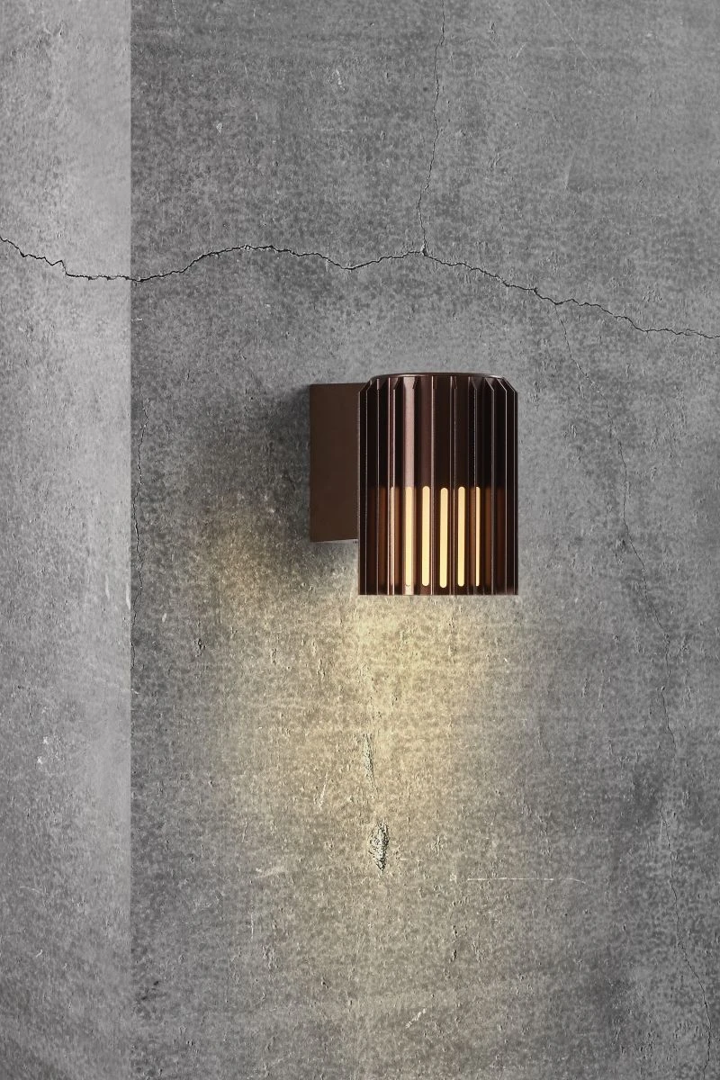 Mit der richtigen Außenbeleuchtung kann man sich nicht nur besser im Dunkeln zurecht finden, sie setzt auch Akzente, kreiert Stimmungen und betont bestimmte Bereiche des Terrains. Achten Sie daher bei der Gestaltung des Außenbereiches auch darauf, wo es an Licht bedarf. Die 16,8cm hohe Aludra Wandleuchte mit einer Oberfläche aus metallisch braun lackiertem Aluminium ist kompakt designt und vielseitig einsetzbar. Sie dient hervorragend zur Beleuchtung des Eingangsbereiches, setzt Akzente an der Hauswand oder unterstützt die stimmungsvolle Terrassenbeleuchtung. Aludra metallisch braun eignet sich auch zur Installation in Parallelschaltung was die gleichmäßigen Beleuchtung von Wegen entlang von Wänden begünstigt. Für einen WOW- Effekt beim Heimkommen im Dunkeln sorgt der schöne Licht-, Schatteneffekt der Außenleuchte vorausgesetzt man bestückt die E27 Fassung mit einem passenden Leuchtmittel. Am Tage glänzt Aludra mit ihrem außergewöhnlich skulpturalen Design. Mit der Schutzart von IP45 ist die Wandlampe perfekt als Außenbeleuchtung einsetzbar.